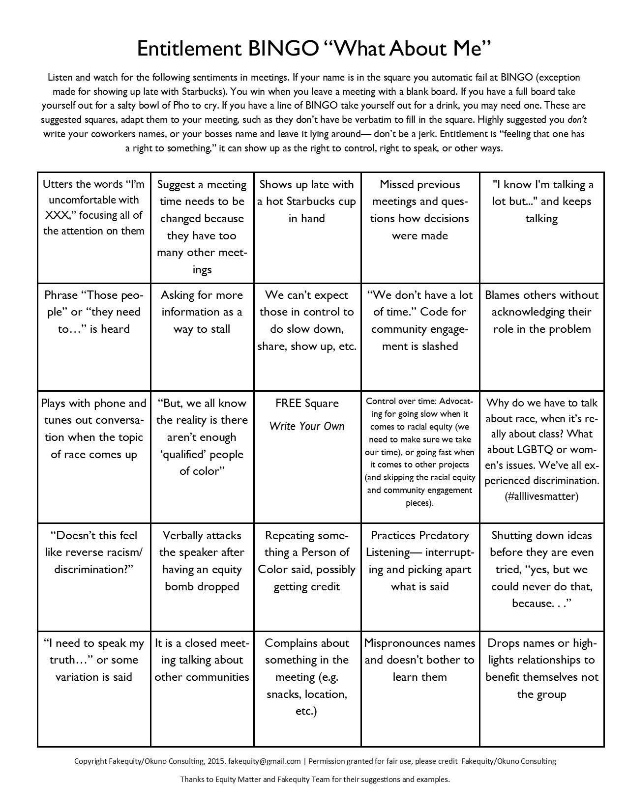 Entitlement BINGO was born out an annoyance of listening to people talk about themselves and feel that equity work should be centered on their needs versus community needs. There are times we may slip into entitlement and privileged positions. The true test is can we recognize and own our privilege, and figure out why we are uncomfortable and feeling the need to take control or prove something. Entitlement BINGO is a way to keep us in check.