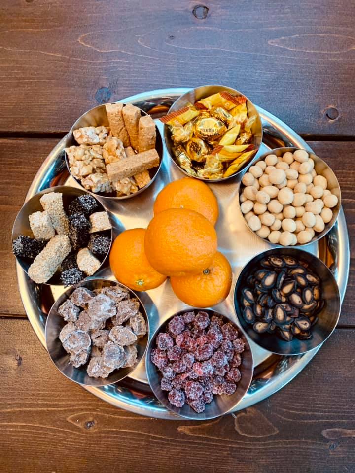 Transcending pan-Asian cultures the snack tray – a round tray filled with different number (5, 6, or 8 depending on culture) of goodies – the tray of togetherness. Megan, a friend, put oranges in the middle a traditional Lunar New Year Food.