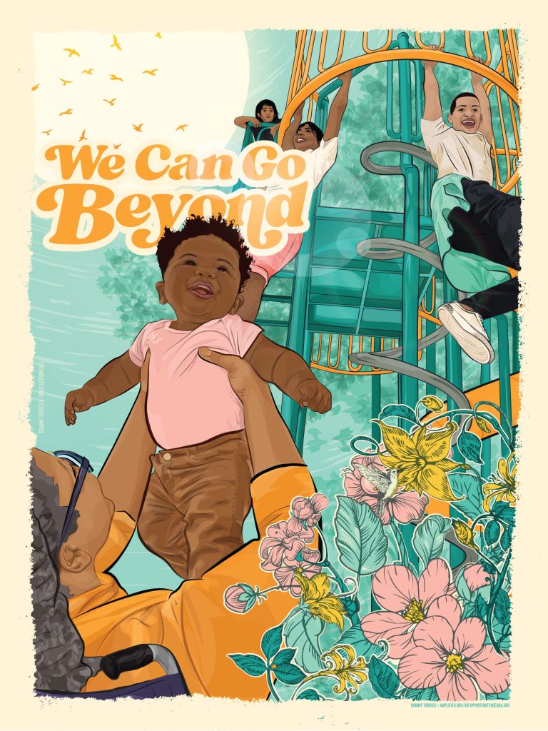 Artwork from Amplifer Art by Rommy Torrico. “We Can Go Beyond” Black mama holding up Black baby, older children playing on playground behind. Part of the https://opportunityagenda.org/ project.