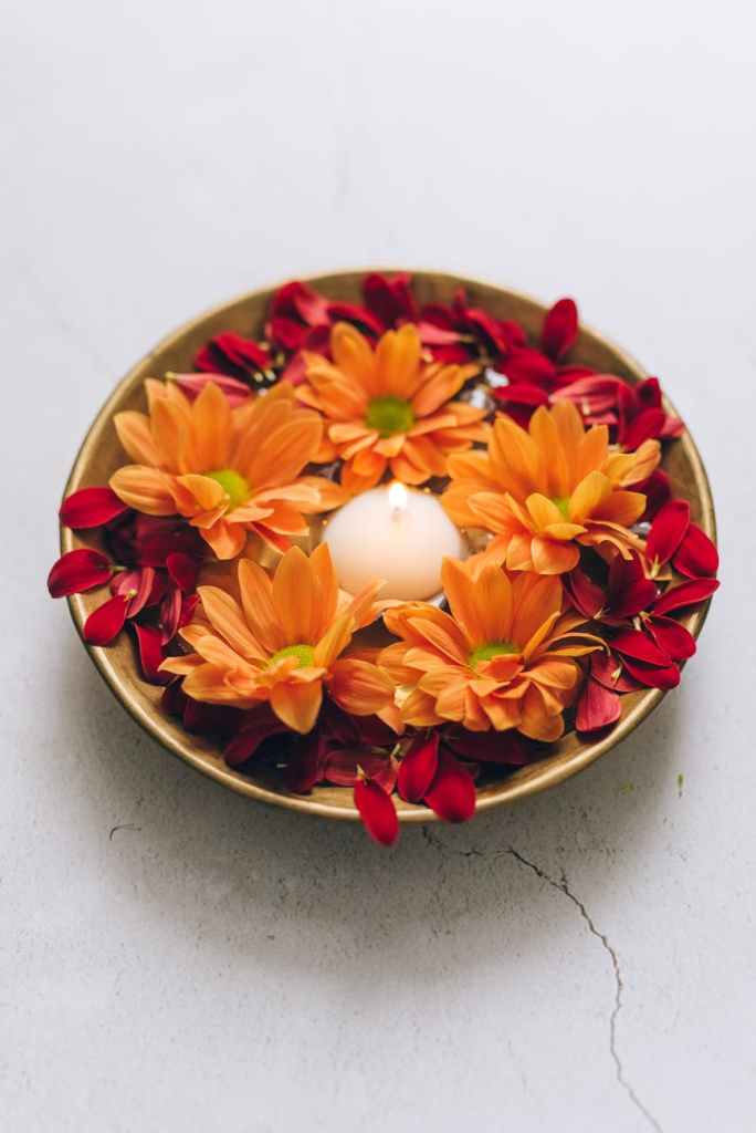 Picture of Diwali orange and red flowers surrounding a lit candle on a white background. Photo by Olya Kobruseva on Pexels.com