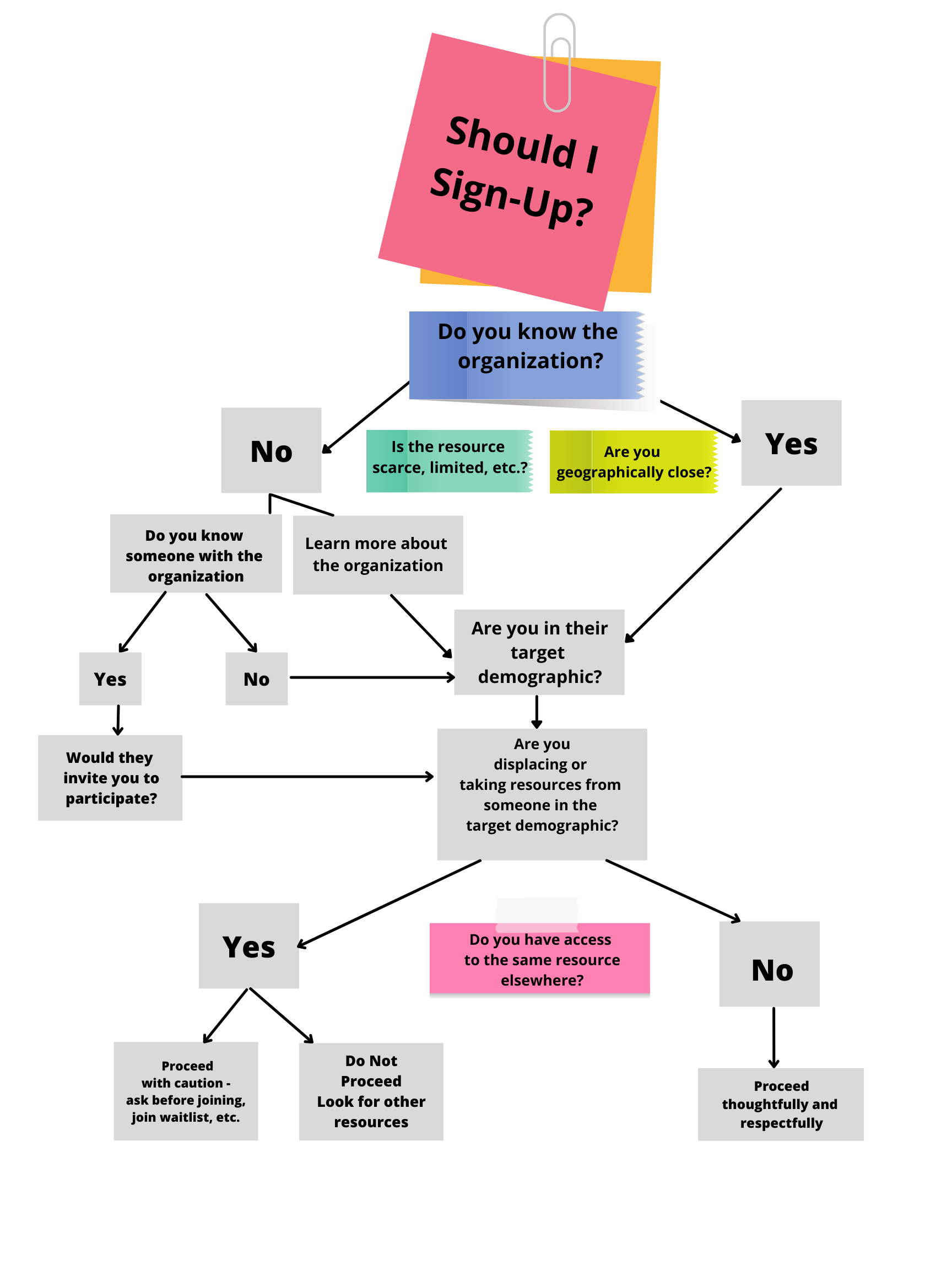 Today’s blog post is a flowchart to help people figure out if they should sign-up for things. I started thinking about this during the release of COVID vaccines, especially the teen and pediatric versions. Those vaccines were released without prioritization on who should get it first. I watched as parents tripped over themselves trying to book, some might say ‘score’ appointments. I also watched as people with privileges would book appointments at POC clinics even though they had never used those clinics before or stopped to think about who those clinics served. This flowchart can also be used for other things like asking yourself if you should sign up for certain programs or benefits. It is most helpful for thinking about limited resources — not as my friend “don’t use it to think ‘should I buy oranges from Safeway or the POC grocery store.”
