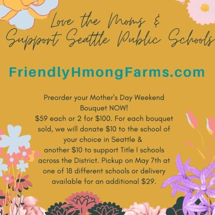 I want to highlight a very cool fundraiser. Friendly Hmong Farms is hosting a Mother’s Day flower sale (however you define mother or just order spring flowers for yourself). It is a win-win-win. The sale benefits Seattle Public Schools, a match will go to a Title 1 (high poverty school), and it supports POC farmers. This is their biggest flower selling weekend of the season; the pre-sales will give them a boost. If you’re not in Seattle and want to support you can order flowers on the website and have them donated or contact fakequity@gmail.com and I’ll help you figure out a way to support the fundraiser.