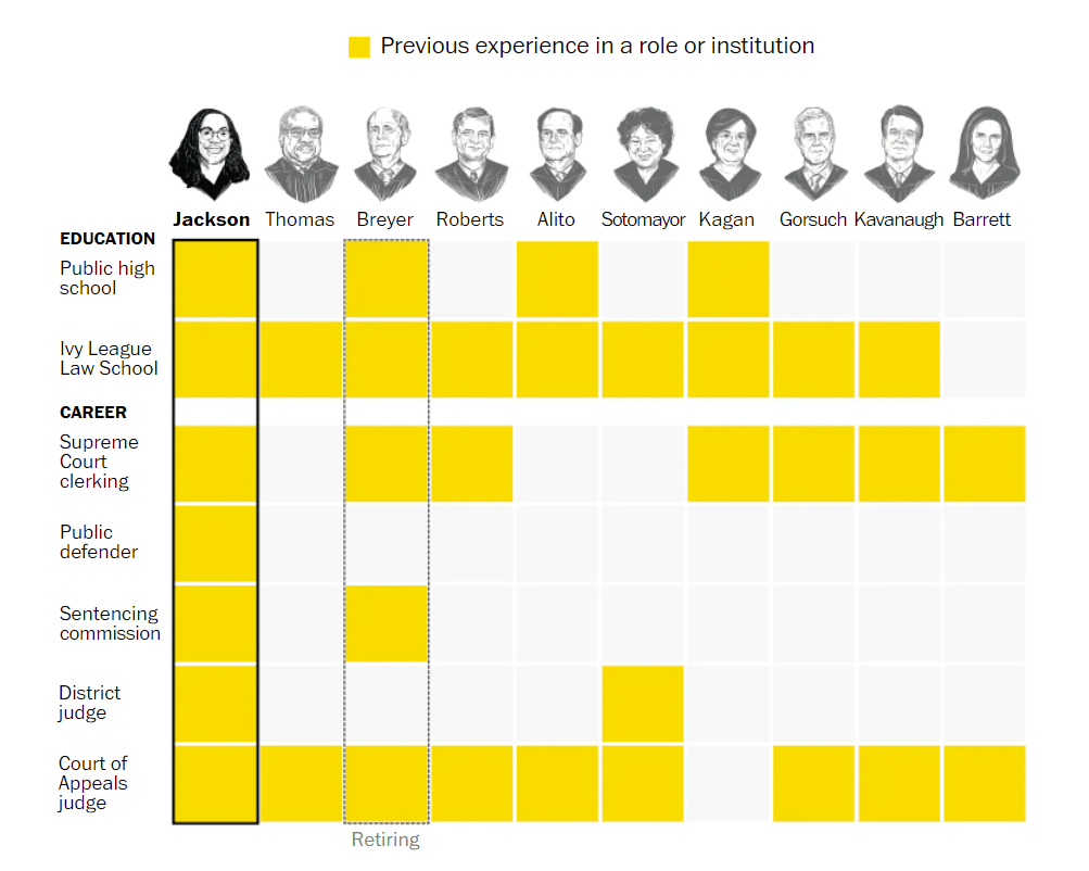 This image by the Washington Post also highlights how insular the experiences of the justices are. All but Justice Barrett graduated from an Ivy League law school, most clerked in the Supreme Court, and all but Justice Kagan served on the Court of Appeals. These are prestigious and noteworthy, but we should also question if having such similar experiences is what the court needs. Does it lead to groupthink or shortcuts in understanding versus interrogating to understand and interrogating to believe something to be true?