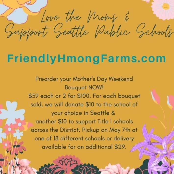 I want to highlight a very cool fundraiser. Friendly Hmong Farms is hosting a Mother’s Day flower sale (however you define mother or just order spring flowers for yourself). It is a win-win-win. The sale benefits Seattle Public Schools, a match will go to a Title 1 (high poverty school), and it supports POC farmers. This is their biggest flower selling weekend of the season; the pre-sales will give them a boost. If you’re not in Seattle and want to support you can order flowers on the website and have them donated or contact fakequity@gmail.com and I’ll help you figure out a way to support the fundraiser.