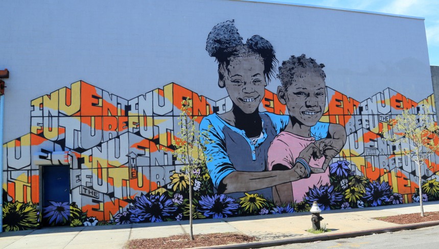 Photo of a mural of two Black sisters left girl’s hands making a heart shape, both smiling. Source: Flickr / lunapark