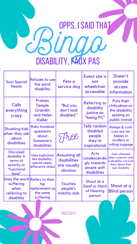 July is Disability Pride Month. To reflect and learn about disability pride I put together a BINGO board on things not to do wih and around people with disabilities. We’ve all slipped up, but knowing and learning is part of being an ally and growing. If you’re wondering why some of them are on the board take a moment to learn about it. A special thank you to Carrie and G.B.N. for helping with this post. They are both connected with different parts of the disability justice community and I’ve been fortunate to learn from them and with them.