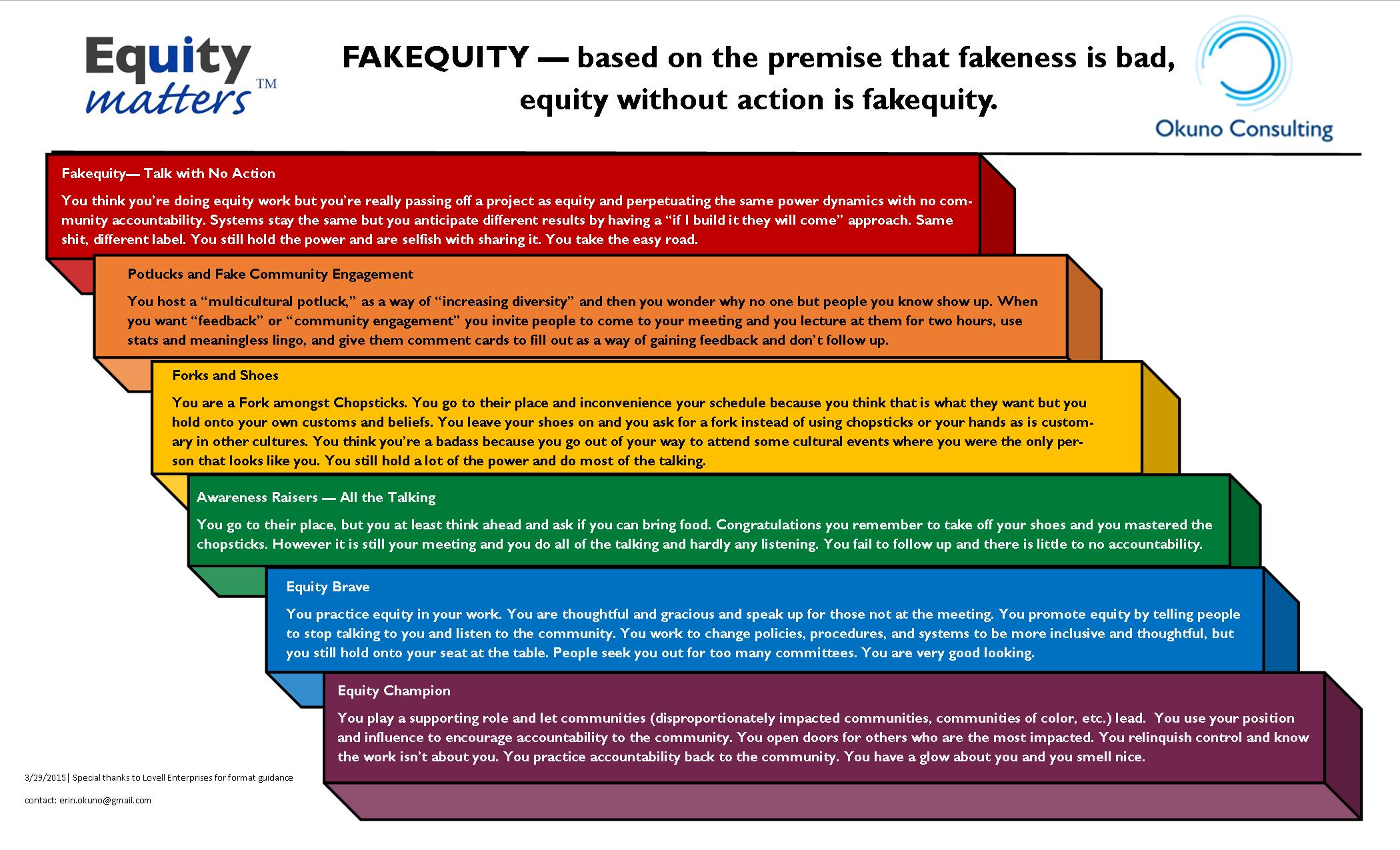 We blog about racial equity and its nemesis Fakequity. Some of the posts may veer off towards equity’s siblings and cousins diversity, inclusion, culture, community engagement, accountability, etc. They are all related and we need to understand and think about a lot of different things in order to get towards equity.